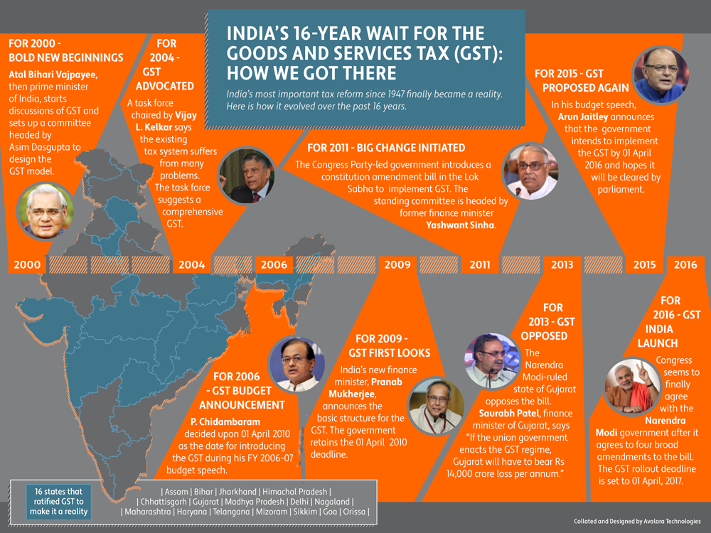 16 seems to be a magic number for the mother of all tax reforms, Goods and Services Tax (GST), as after 16 years of to and fro, GST India has got a green flag with 16 states ratifying the act. Finally a distant dream is becoming a reality soon. Here is an interesting infographic showing the important milestones of this roller coaster journey.