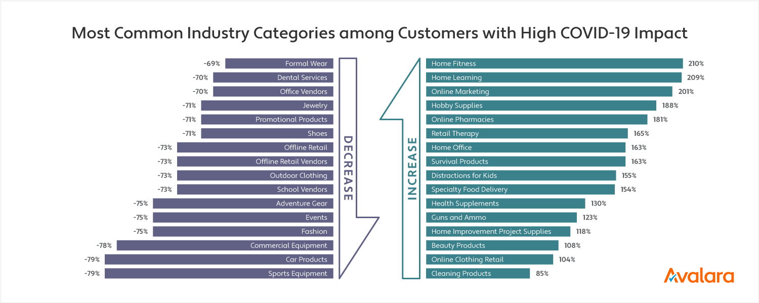 Our data also showed that discretionary spending on products no longer useful for consumers staying at home took a nosedive. Of the Avalara customers that saw a decline, businesses that sell products primarily used in public or social gatherings outside of the home have seen a downward trend.