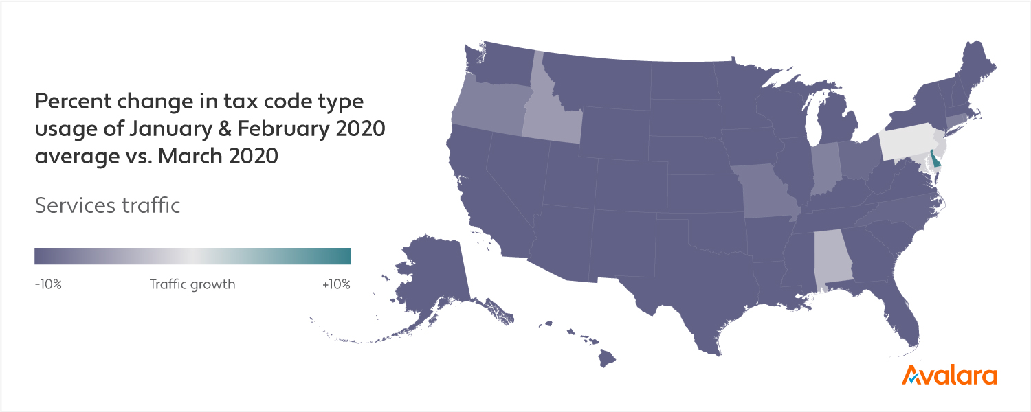 While overall spending traffic at the state level offered some interesting takeaways, our team wanted to take a closer look at specific tax code types to see how the impact varied across the country. We decided to look at transactions under the “services” tax code, which includes a wide range of services from tree trimming and pool cleaning to flying lessons and sign painting.