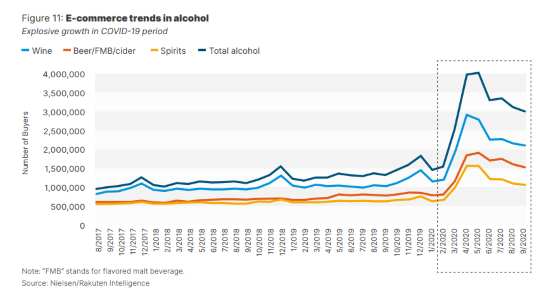 Despite the restrictions, DTC sales of beer/cider and spirits also surged during the early days of the pandemic and continue to track higher than before COVID-19.