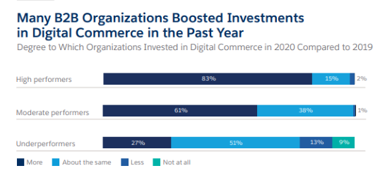 Like B2C businesses, most B2B companies were already selling online prior to the pandemic, and many increased investments in digital commerce during 2020: 83% of high performers and 61% of moderate performers spent more on digital commerce in 2020 than in 2019. By contrast, only 27% of underperformers increased investments in that area. Companies that invested the most saw the best results; a whopping 70% of high performers said their remote sales performed “extremely well” in 2020, while only 11% of underperformers could say the same.