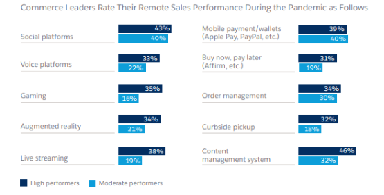 High-performing organizations don’t sit back and wait for consumers to land on their website — they go find them where they are. About 88% of these top-performing businesses increased investment in contextual or embedded commerce experiences in 2020. In addition to social media platforms, where sales increased by 104% from between Q2 2019 and Q2 2020, successful businesses explored augmented reality, gaming platforms, live streaming, and voice platforms. These proved prosperous for both moderate performers and high performers, but businesses that invested heavily in these new channels saw the greatest returns.