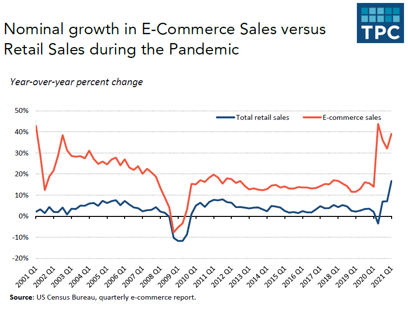 State officials know ecommerce sales skyrocketed during the darkest days of the pandemic, as in-store sales plummeted. Online sales grew nearly 44% year over year in the first three months of the first wave. During the same period, year-over-year total retail sales dropped by 3.6%.