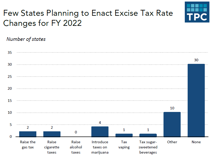 Thus, six of the states surveyed expressed an interest in legalizing — and taxing — recreational marijuana. Scott says taxing marijuana is so lucrative it may have sucked the air out of other so-called “sin” taxes, but at least one state is looking to amend its tax on sugary beverages, and some states are interested in taxing or increasing the rate on electronic cigarettes and other vaping products. At the federal level, the Prevent All Cigarette Trafficking (PACT) Act was recently expanded to include all electronic nicotine delivery systems.